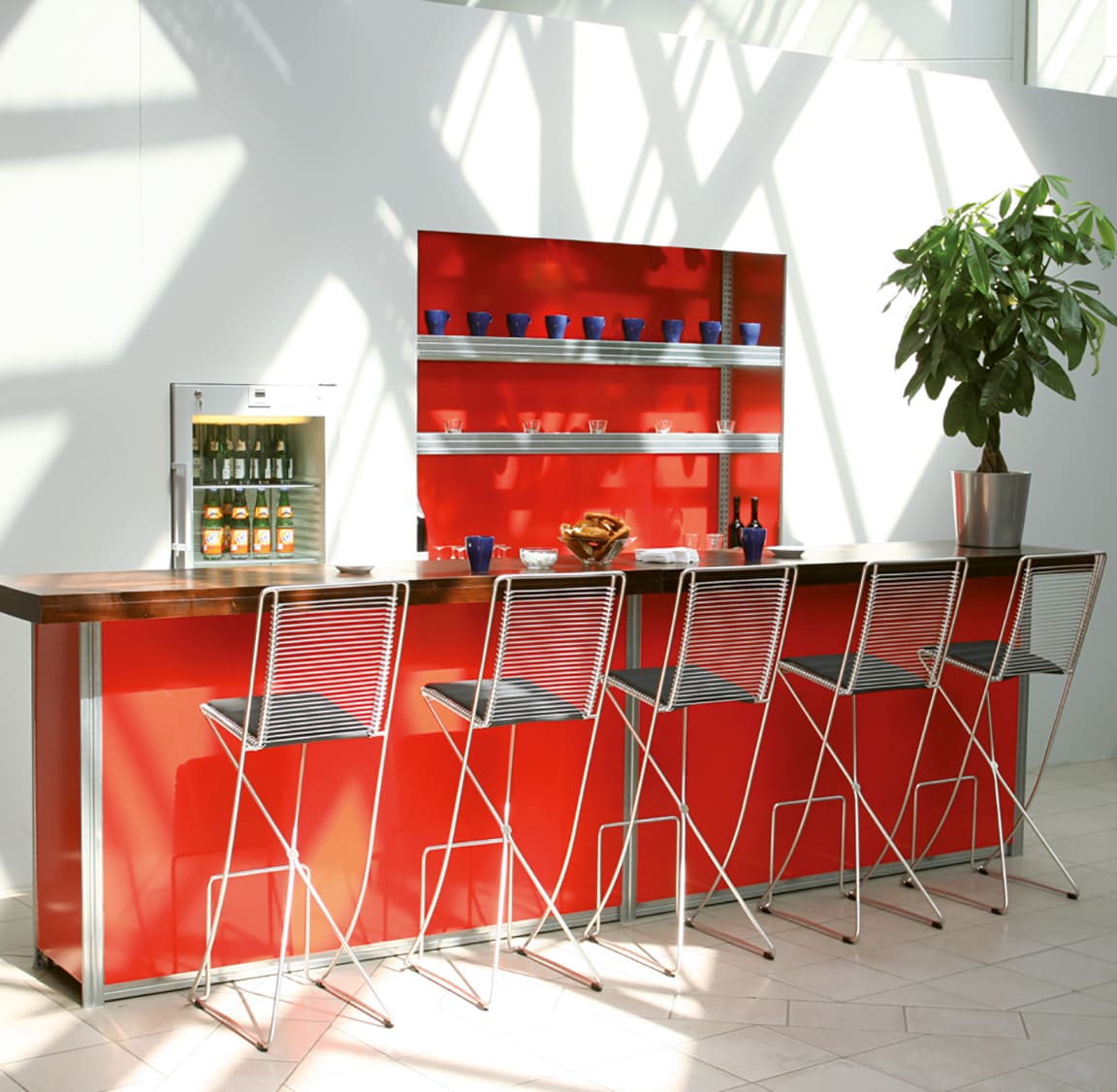 Die Büroregale sorgen, wie es der Name natürlich sagt, vorwiegend Ordnung im Büro. Allerdings gibt es viele verschiedene Möglichkeiten, wo die Regale aus hochwertigen Stahl, ihren Platz finden. Wie in der Abbildung gezeigt, werden sie auch gerne zum sortieren von Gläsern, im industriellen Look verwendet. Durch die enormen Traglasten je Ebene und die dazugehörige Skalierbarkeit, sind dem System kaum Grenzen gesteckt. Beginnend mit dem Grundfeld, gibt es dazu die Möglichkeit weitere Felder mit dem Anbaufeld-System aufzustocken.