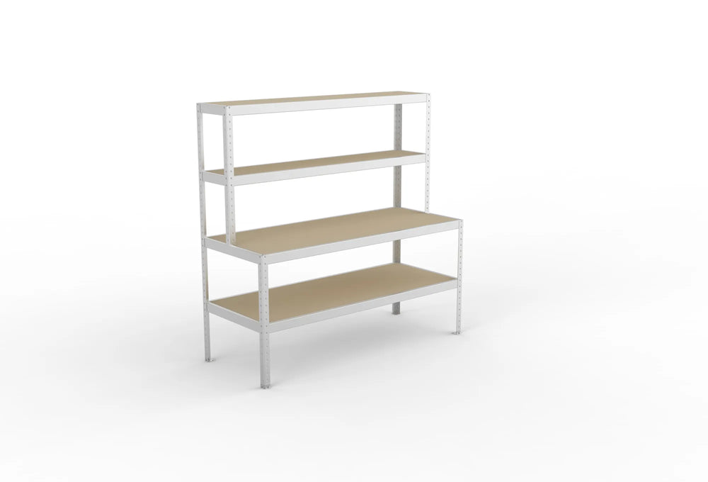 Der Packtisch bietet zwei großzügige Haupt-Lagerebenen für schwere Packgüter oder Versandmaterialien. Darüber hinaus ist ein integriertes Aufsatzregal mit zwei zusätzlichen, schmaleren Ablageebenen verbaut – ideal für Klebebänder, Etiketten, Kartons oder Ordner. Alles Wichtige bleibt griffbereit, ohne die Arbeitsfläche zu blockieren.