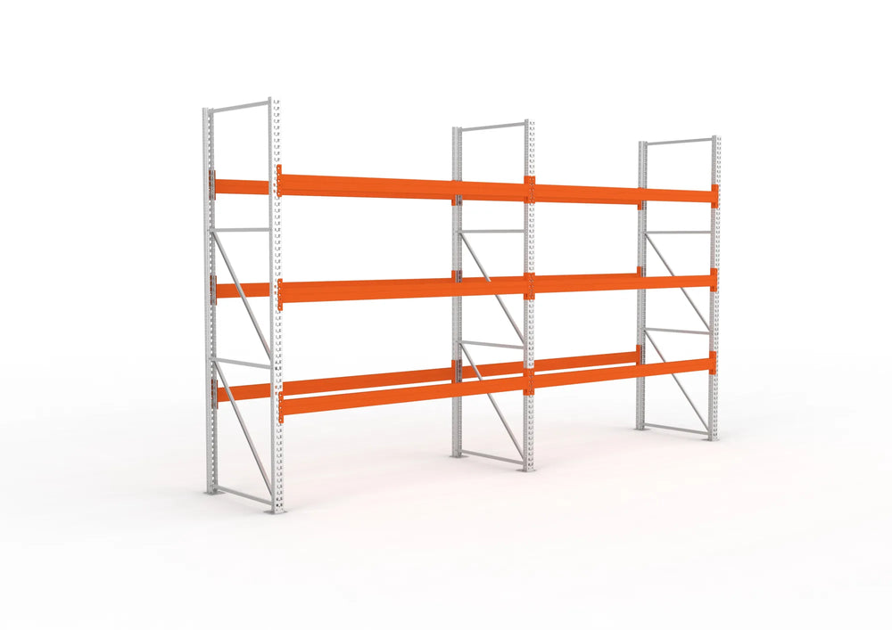 Das Komplettset besteht aus einem Grundregal und einem Anbauregal und bietet Platz für insgesamt 24 Europaletten in Längseinlagerung. Dank der modularen Bauweise können Sie Ihr Regalsystem jederzeit durch weitere Anbauregale erweitern und so die Lagerkapazität exakt an Ihren Bedarf anpassen.